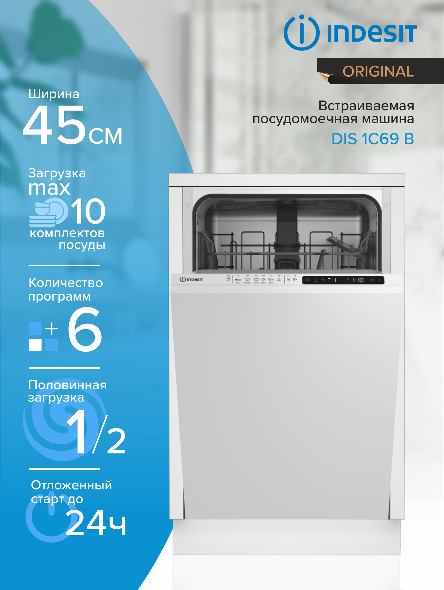 Посудомоечная машина встраиваемая INDESIT 45CM DIS 1C69 B, белый