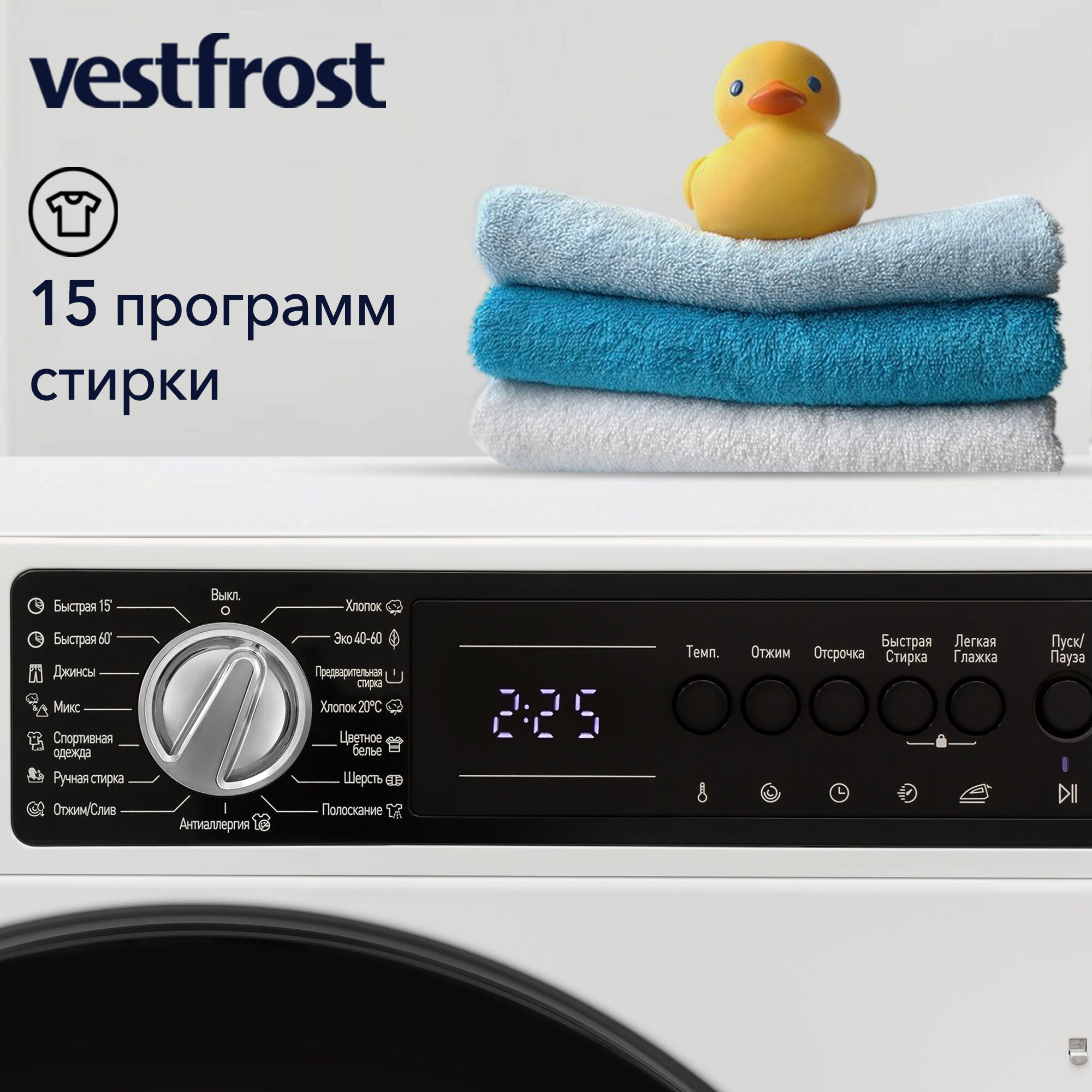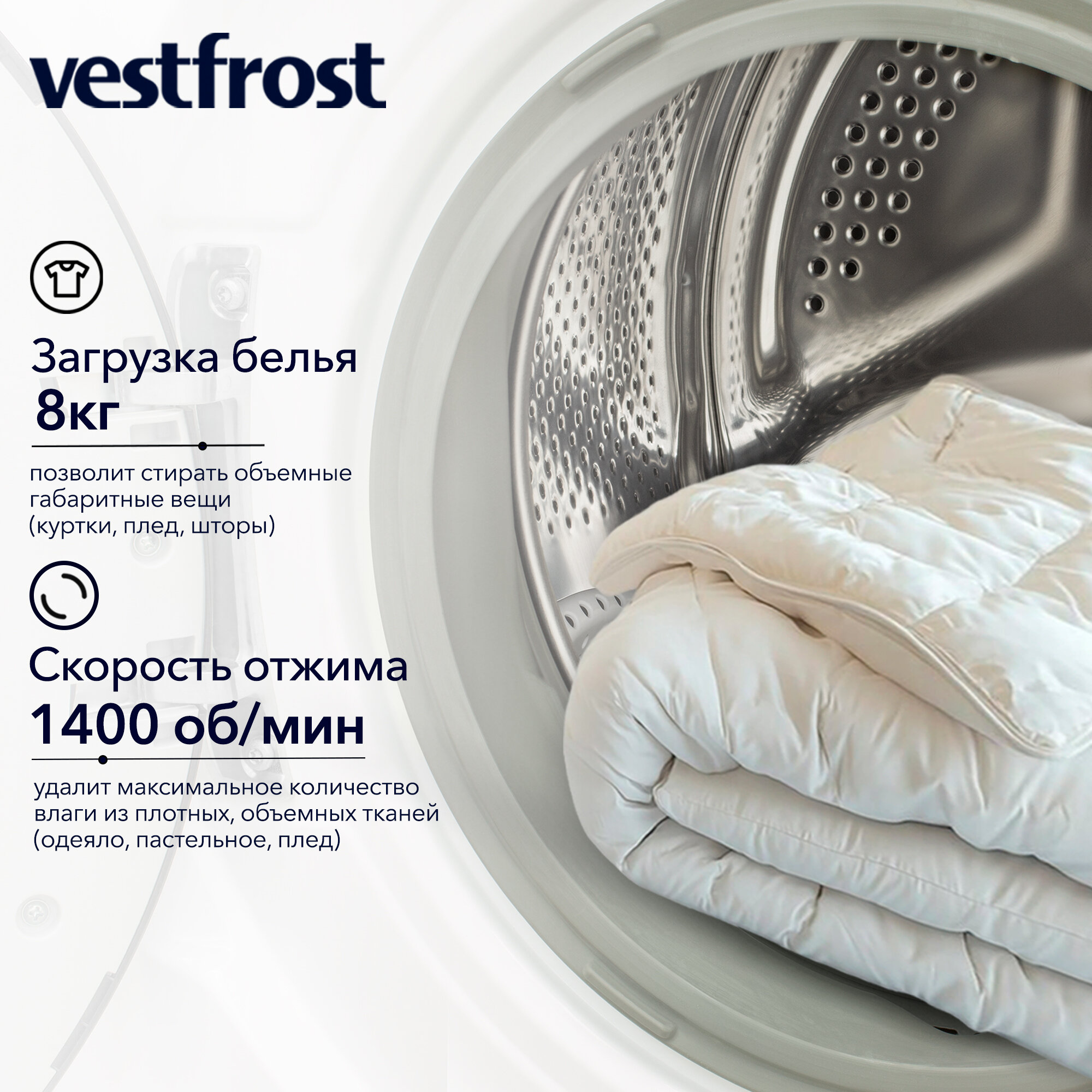 Встраиваемые стиральные машины Стиральная машина встраиваемая Vestfrost 8 кг, 1400 об, инверторный мотор, A+++, отсрочка запуска, половинная загрузка, модель VF814BI03W
