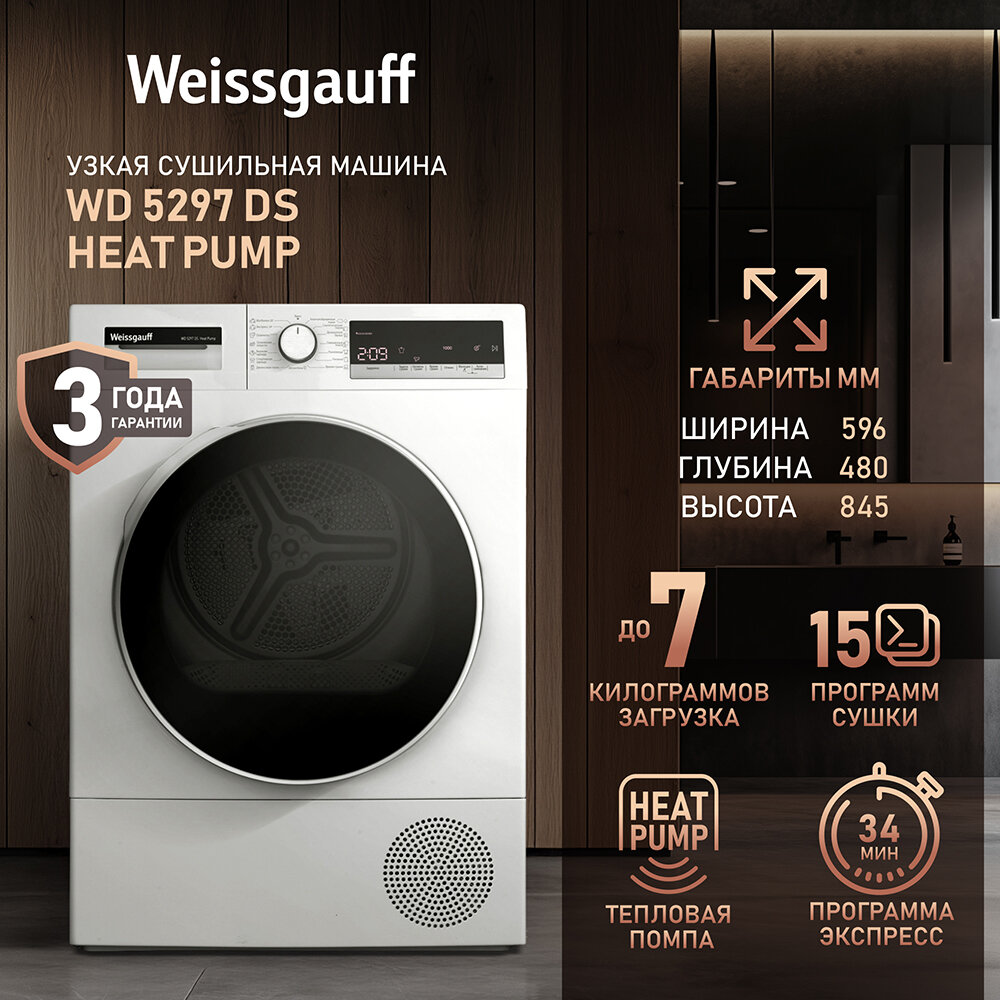 Сушильные машины Сушильная машина Weissgauff WD 5297 DS Heat Pump, узкая, Подсветка барабана, Установка в колонну