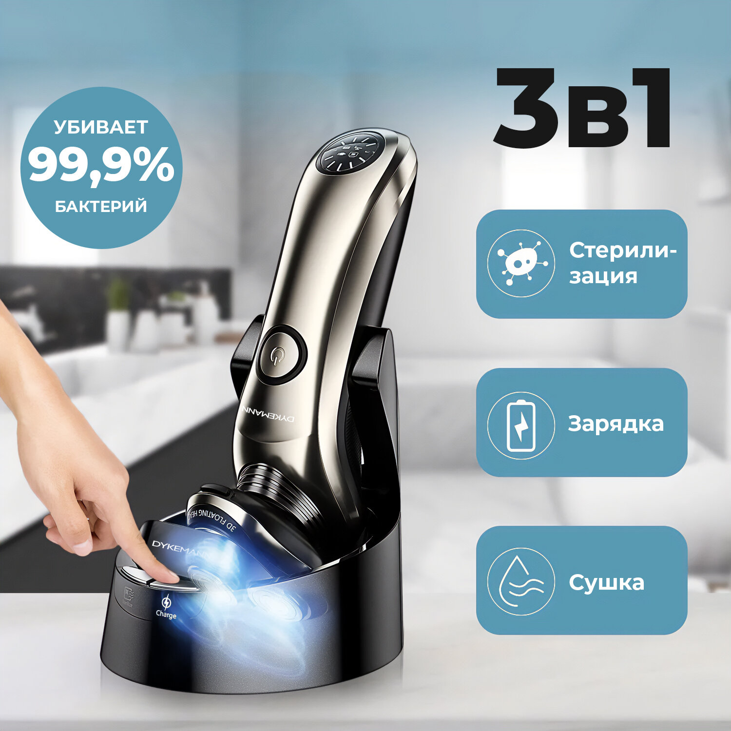Электробритва Электробритва для мужчин Dykemann Richtigkeit N-15 с плавающими 3D-головками, для сухого и влажного бритья, роторная, для ежедневного использования, со встроенным аккумулятором, водонепроницаемая