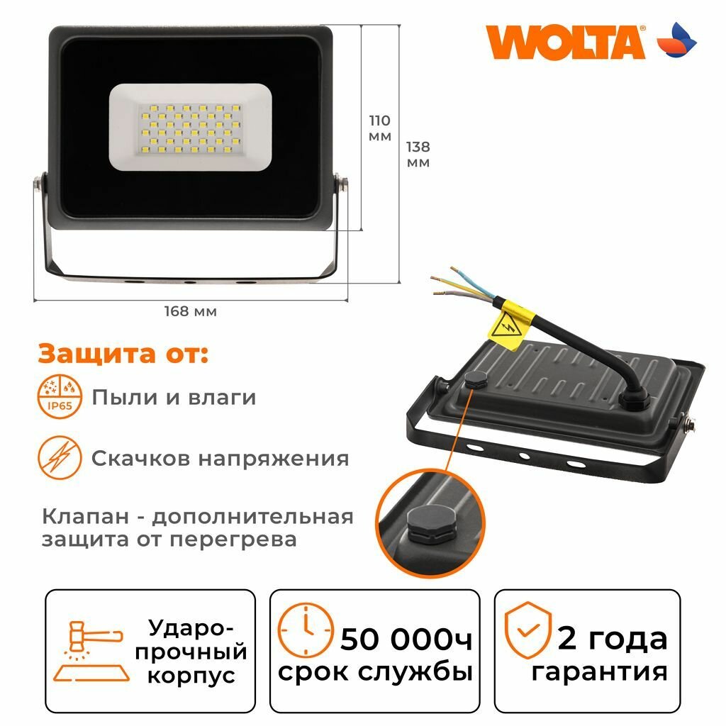 Светодиодный прожектор Wolta WFL-07 30Вт, 6500К, IP65, 2700Лм, серый 990 ₽ Подробнее
