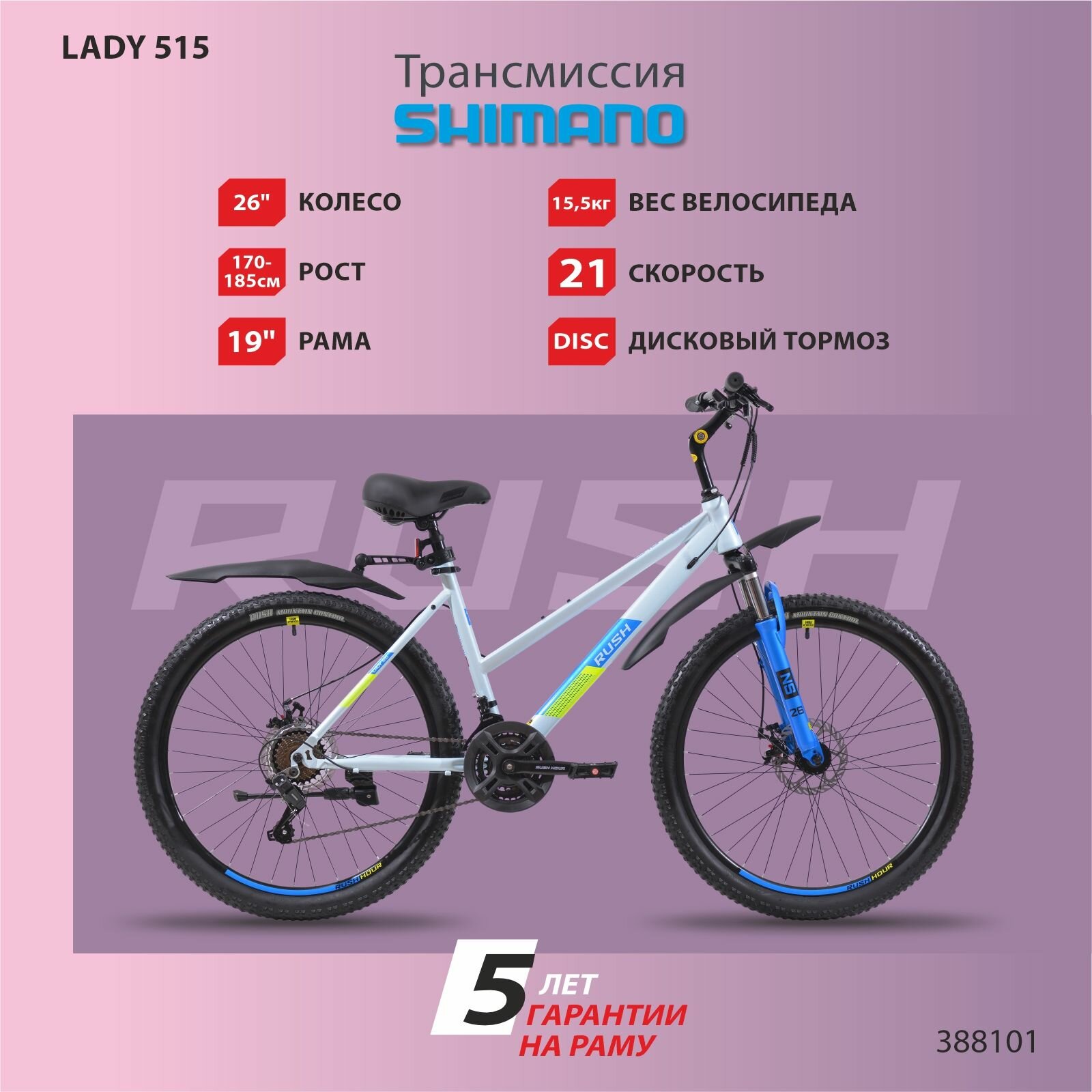 Велосипед горный женский дисковый 26" RUSH HOUR LADY 515 21 скорость белый рама 15" рост 145-165 см. MTB/раш/велосипед женский/для девушки/для девочки/взрослый/hardtail/с амортизацией/SHIMANO