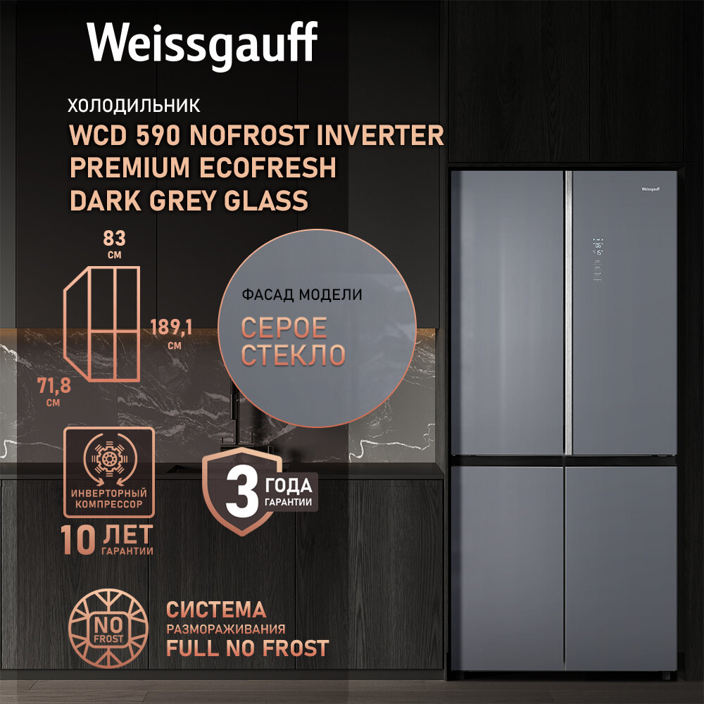 Отдельностоящий холодильник с инвертором Weissgauff WCD 590 Nofrost Inverter Premium Ecofresh Rock Glass, гарантия 3 года, технология Multi Air Flow, Metal-Tech Cooling, суперзаморозка, суперохлаждение, LED-освещение 97 597 ₽ Подробнее