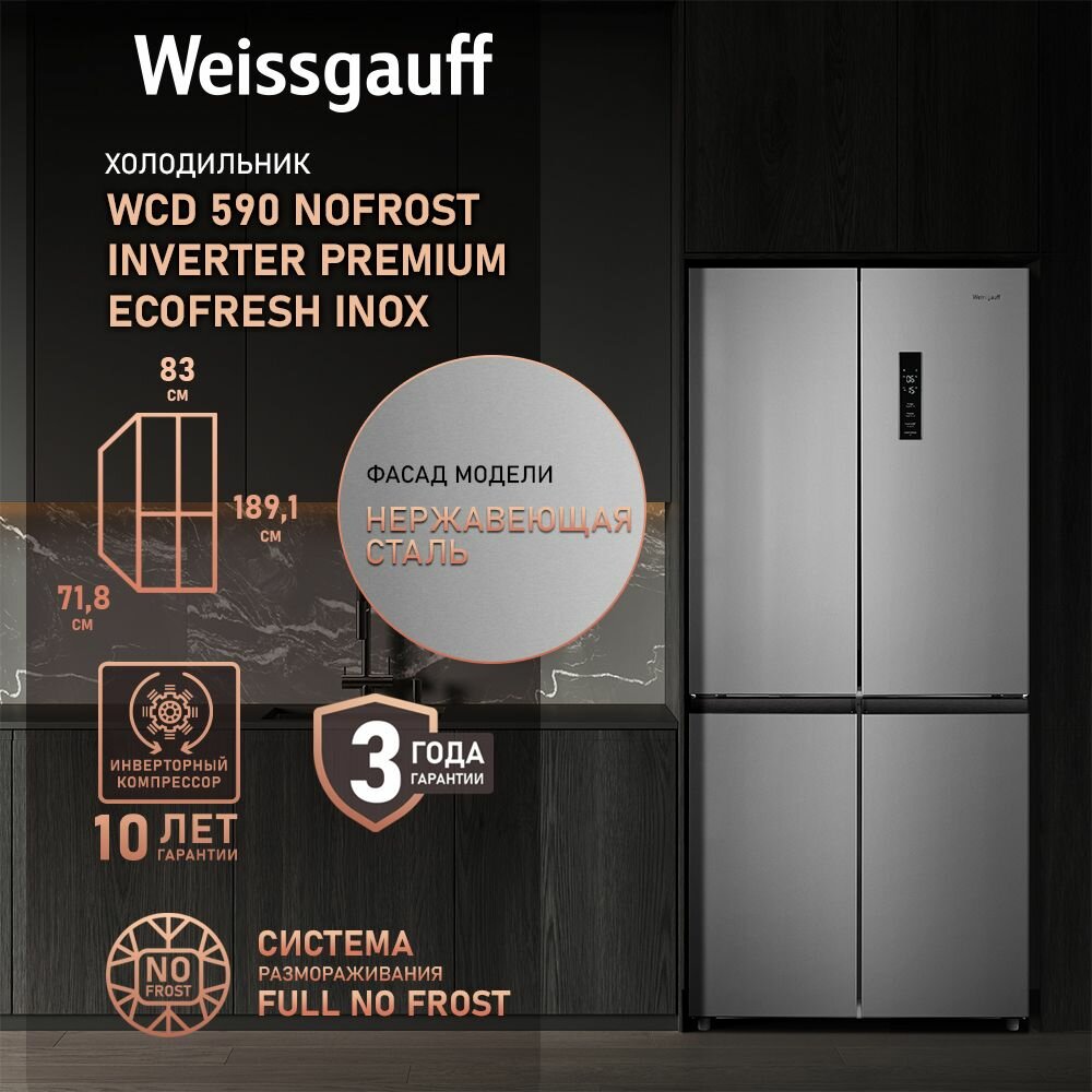 Отдельностоящий холодильник с инвертором Weissgauff WCD 590 Nofrost Inverter Premium Ecofresh Dark Inox 97 990 ₽ Подробнее