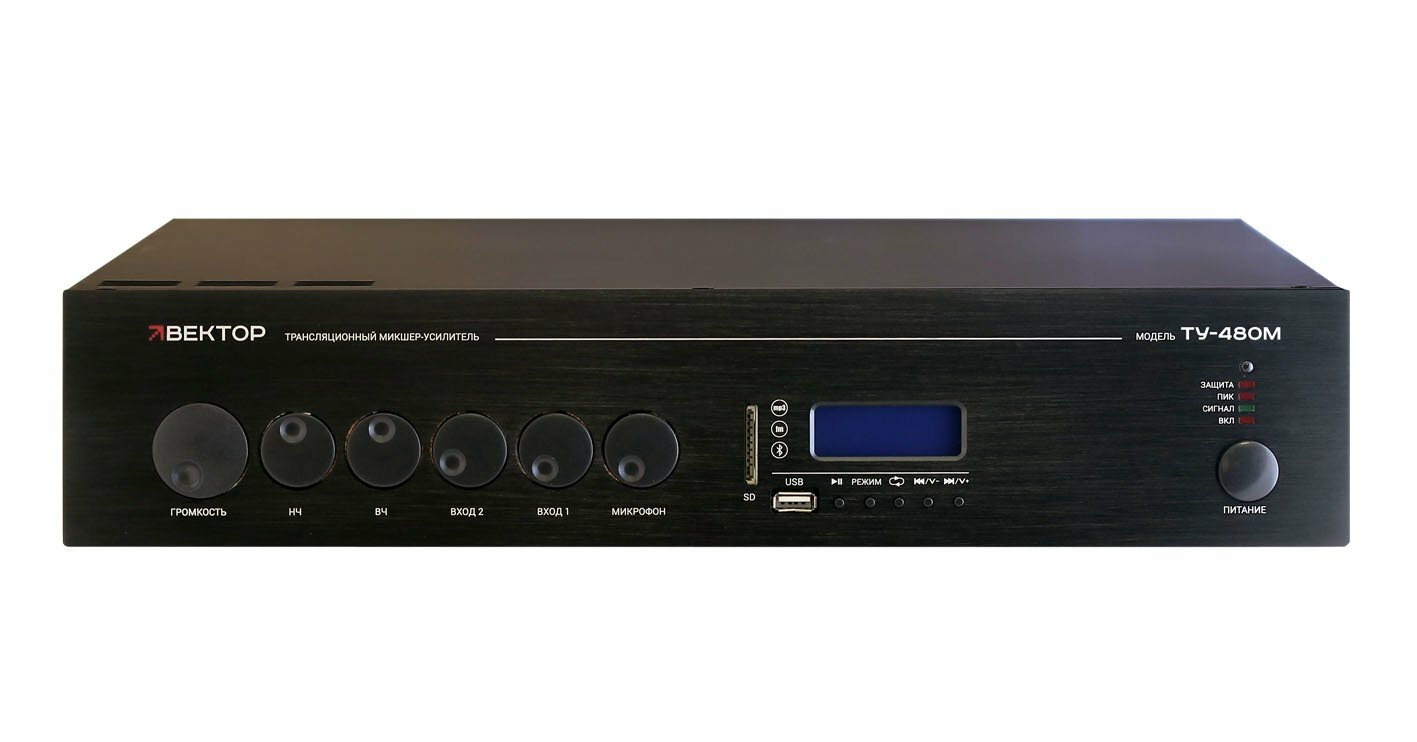 Усилитель Вектор ТУ-480М Компактный комбинированный микшер-усилитель. Мощность 480Вт. Выход 100В\4-16Ом, 1 микр и 2 AUX входа, 1 AUX выход. Цифровой FM тюнер, MP3 плеер, USB, SD, Bluetooth. Питание 220В. Рэковое крепление в комплекте. Размеры 430х88х365 мм. Масса 1