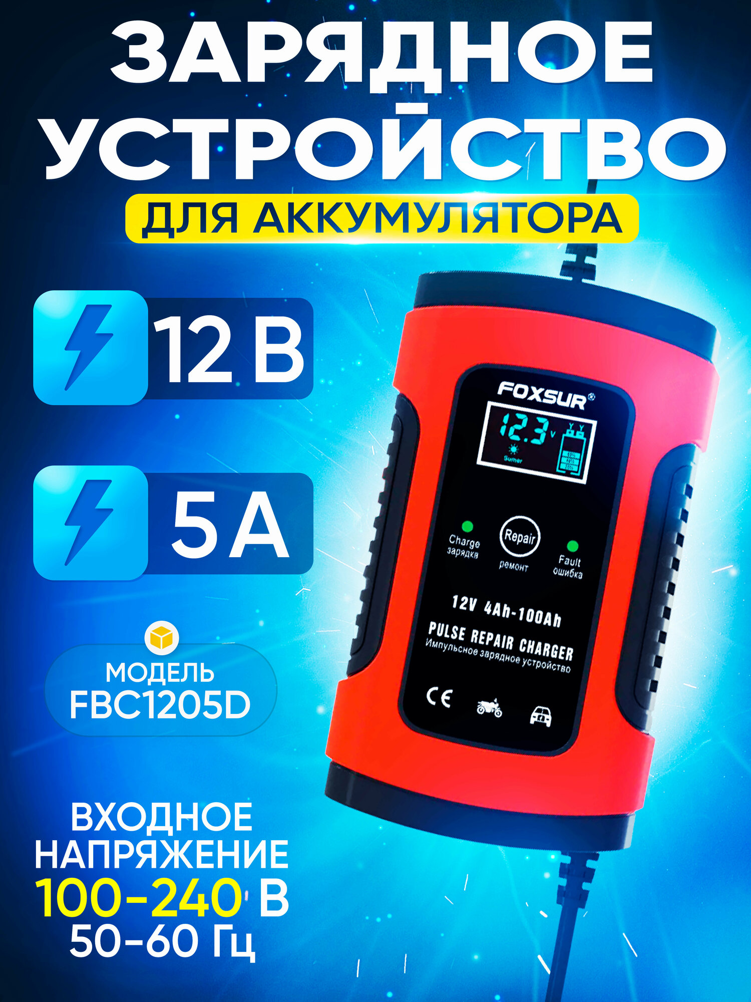 Пуско-зарядные устройства Зарядное устройство для аккумулятора FOXSUR FBC-1205D (12V5A) orange