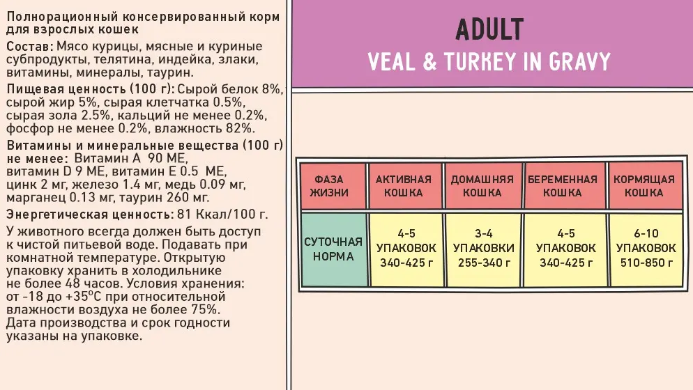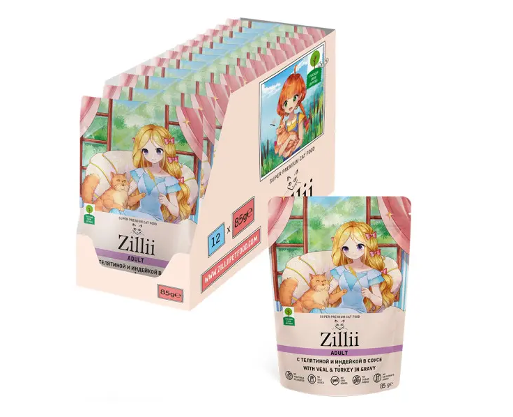 Корм для кошек Zillii Adult Cat Veal&Turkey Влажный корм для кошек Телятина и Индейка в соусе 12 шт по 85 гр