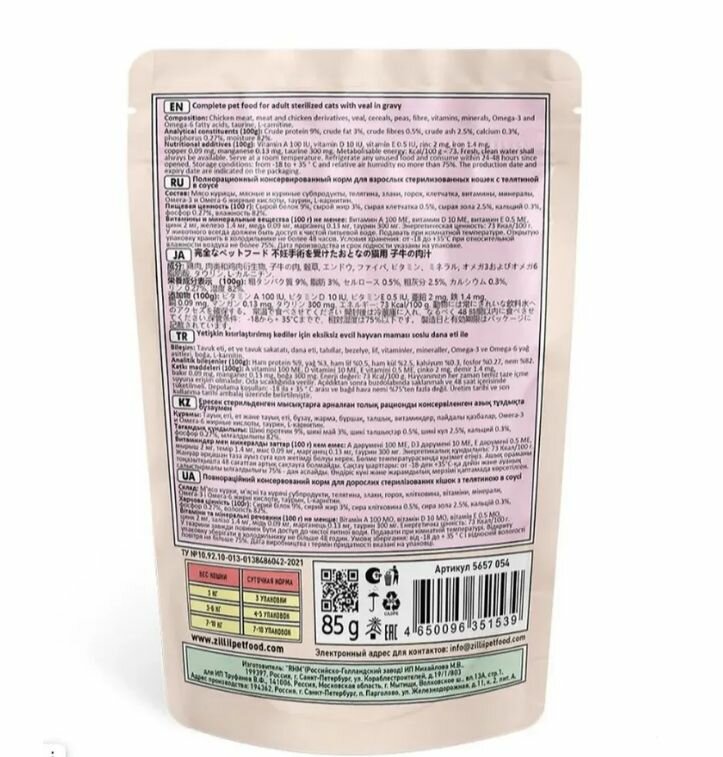 Корм для кошек Корм для кошек влажный ZILLII (Зилли) Adult (пауч) 12шт - 85г, Телятина и Индейка в соусе
