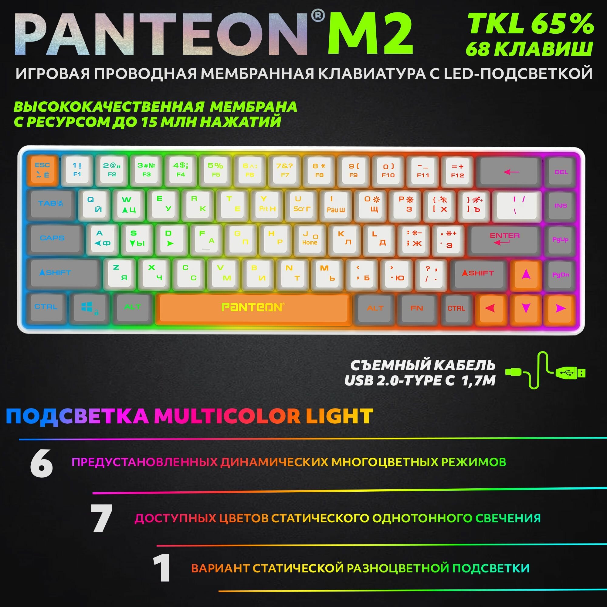 Клавиатуры PANTEON M2 Grey-Ivory(02) Игровая мембранная TKL (65%) клавиатура с LED-подсветкой MULTICOLOR (68 кл, USB), цвет: серый-слоновая кость (02)