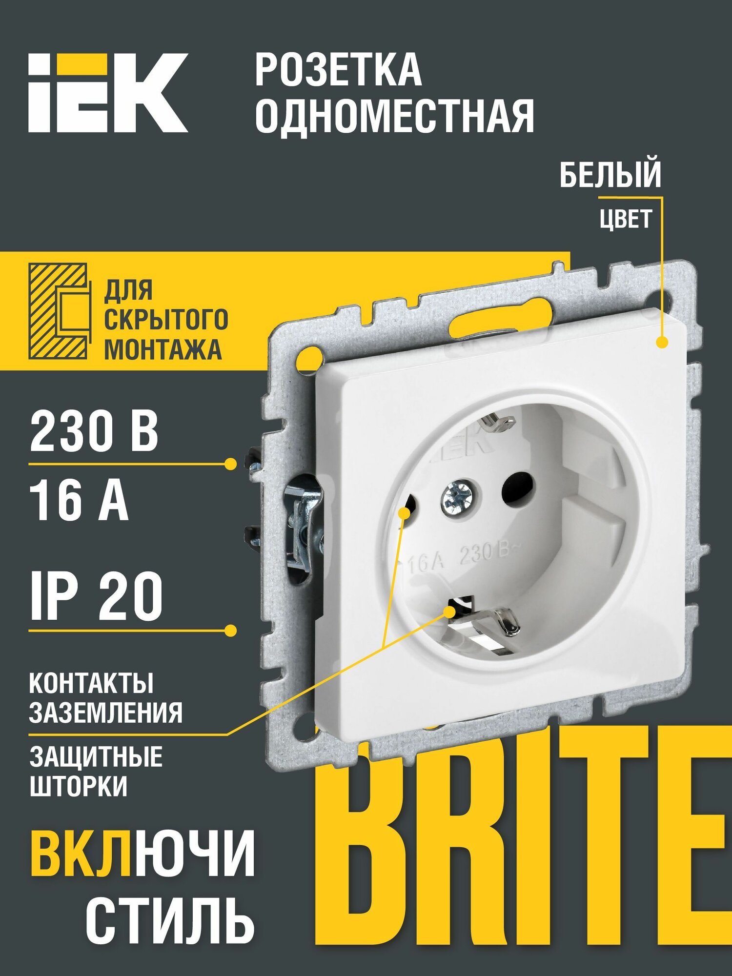 Розетка BRITE РС11-1-0-БрБ 16А с заземл. без защ. шторки бел. BR-R11-16-K01 IEK