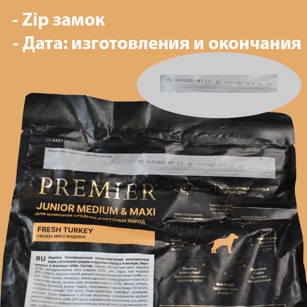 PREMIER LOW GRAIN JUNIOR MEDIUM & MAXI TURKEY низкозерновой для юниоров средних и крупных пород NEW 1 кг