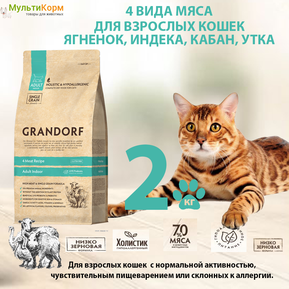 GRANDORF 4 Meat Adult Indoor, 2 кг (сухой корм для кошек 4 мяса: индейка, утка, кабан, ягненок)