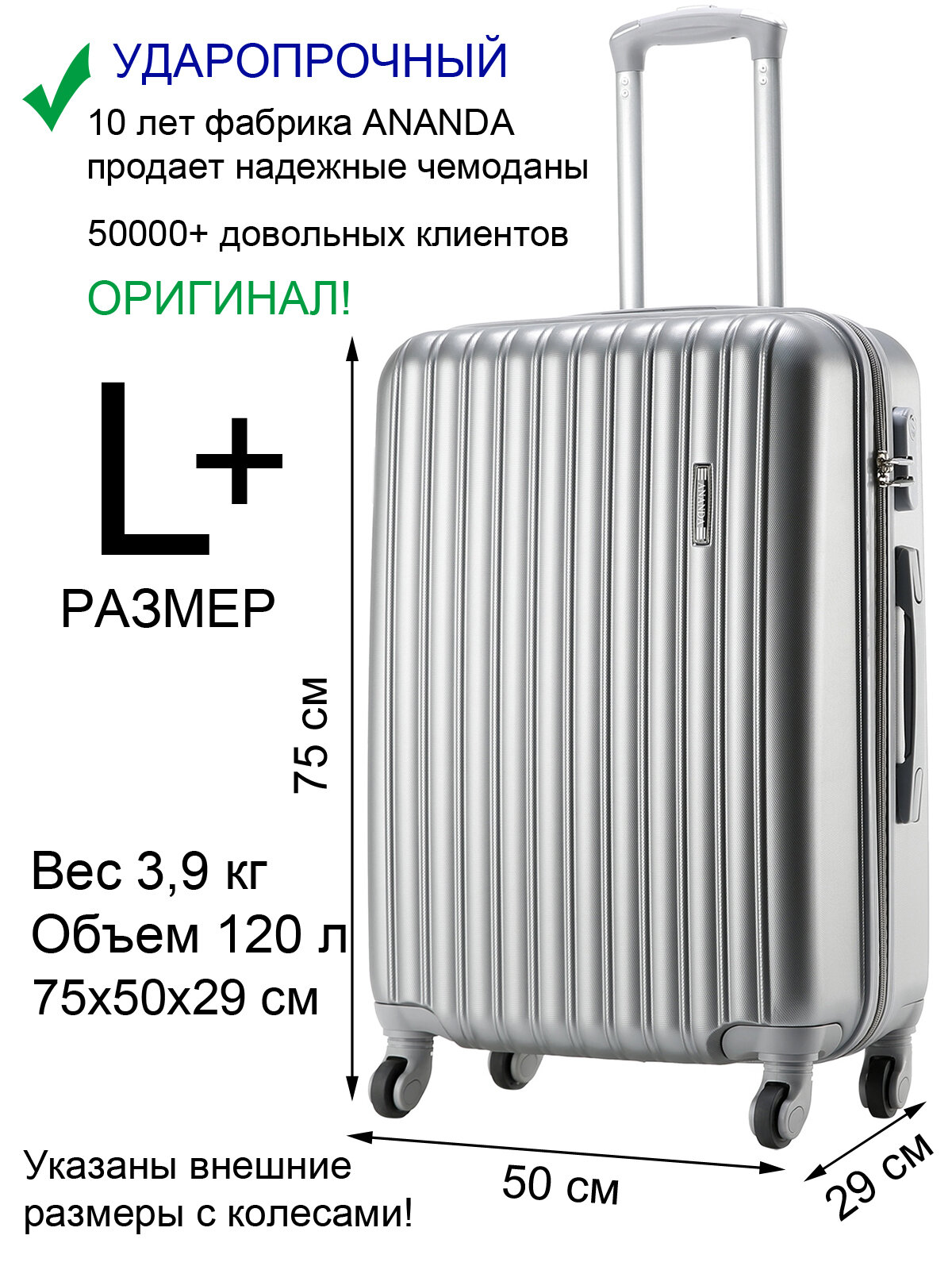 Чемодан на колесах ANANDA, большой размер L, 72 см, 95 л, серебро 5 299 ₽ Подробнее