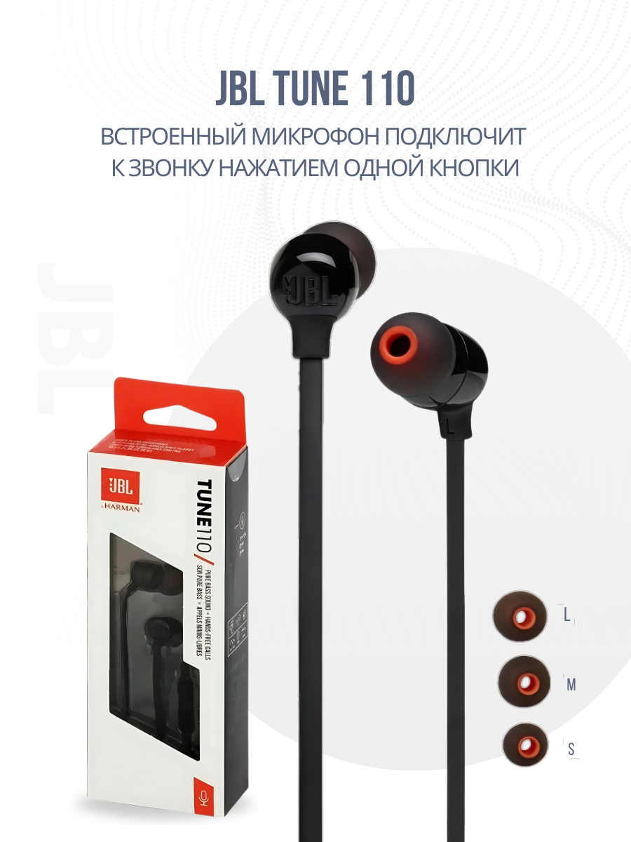 Наушники Наушники проводные JBL T110 внутриканальные, вакуумные с микрофоном, 3,5mm, черные