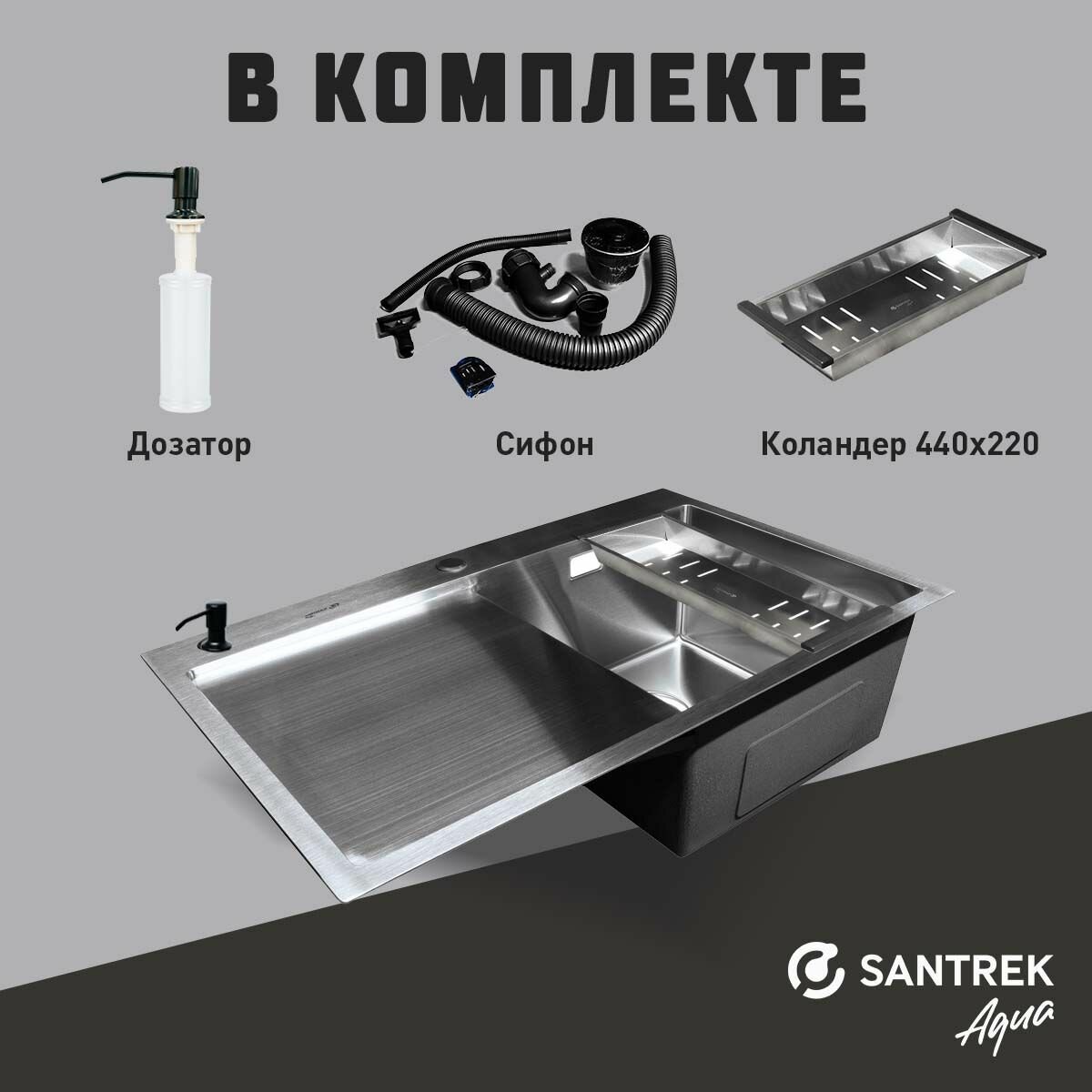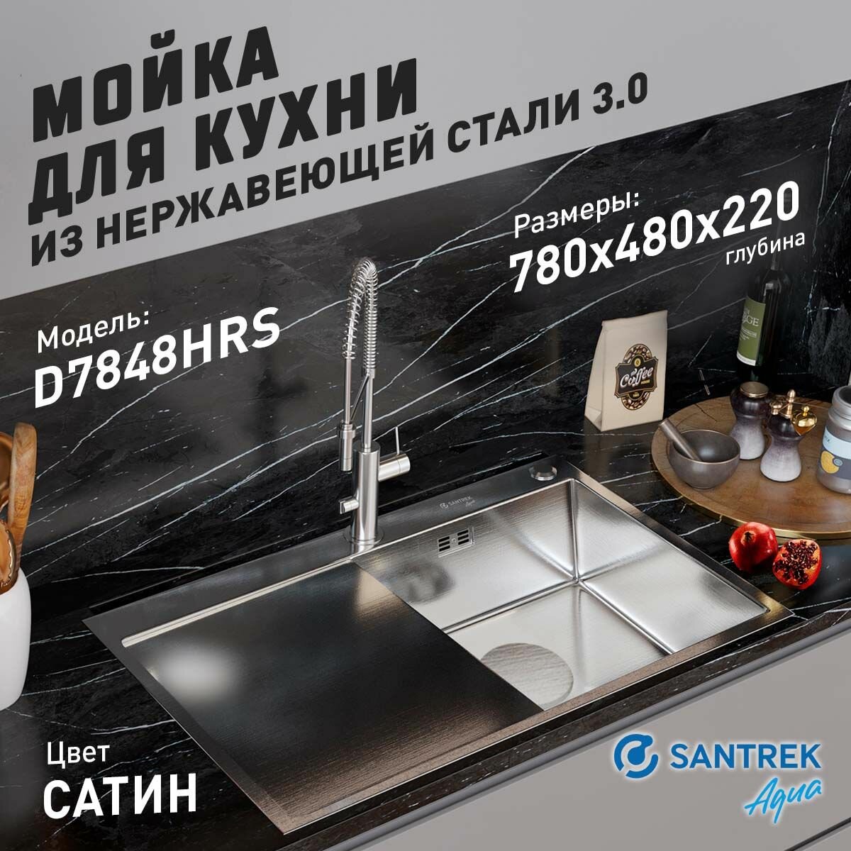 Кухонные мойки Мойка врезная из нержавеющей стали 780х480х220 мм т 3,0 сатин D7848HRS правая (+ сифон+дозатор + колландер 420х220 мм) SANTREK AQUA
