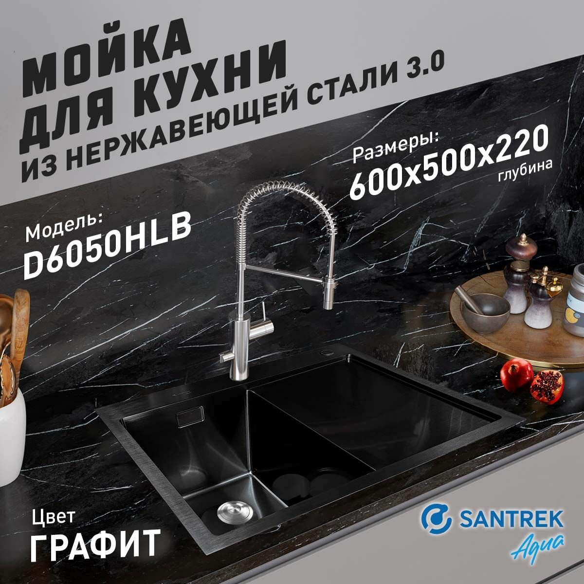 Кухонные мойки Мойка врезная из нержавеющей стали SANTREK AQUA 600х500х220 мм т 3,0 Черный графит D6050HLB левая (+ сифон + дозатор + коландер 440х220 мм)