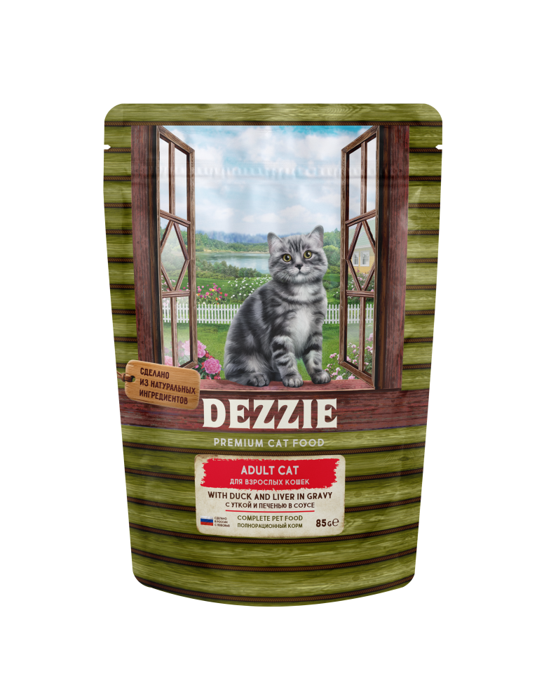 Корм для кошек Dezzie Adult Cat Duck&Liver влажный корм для взрослых кошек с уткой и печенью в соусе, в паучах - 85 г х 12 шт
