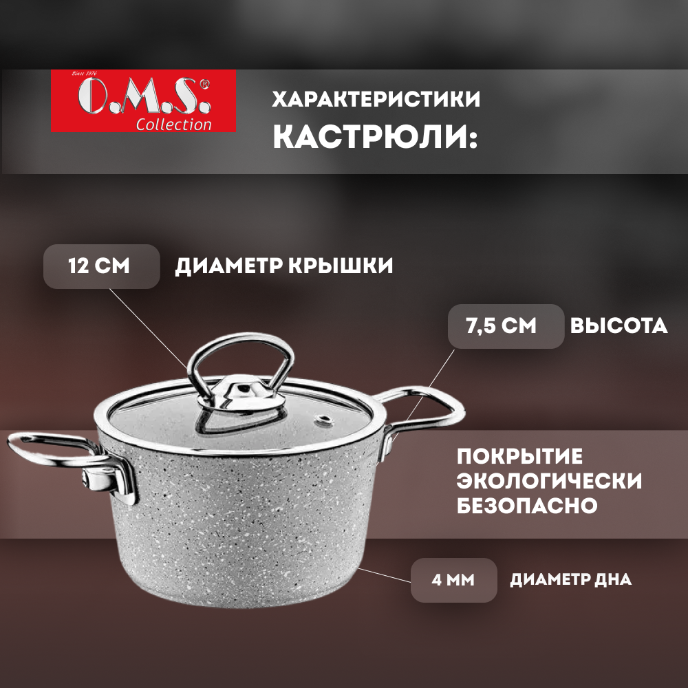 Кастрюли Кастрюля 0,6л с крышкой 12 см. O.M.S. Collection. Антипригарное гранитное покрытие. Цвет: серый.