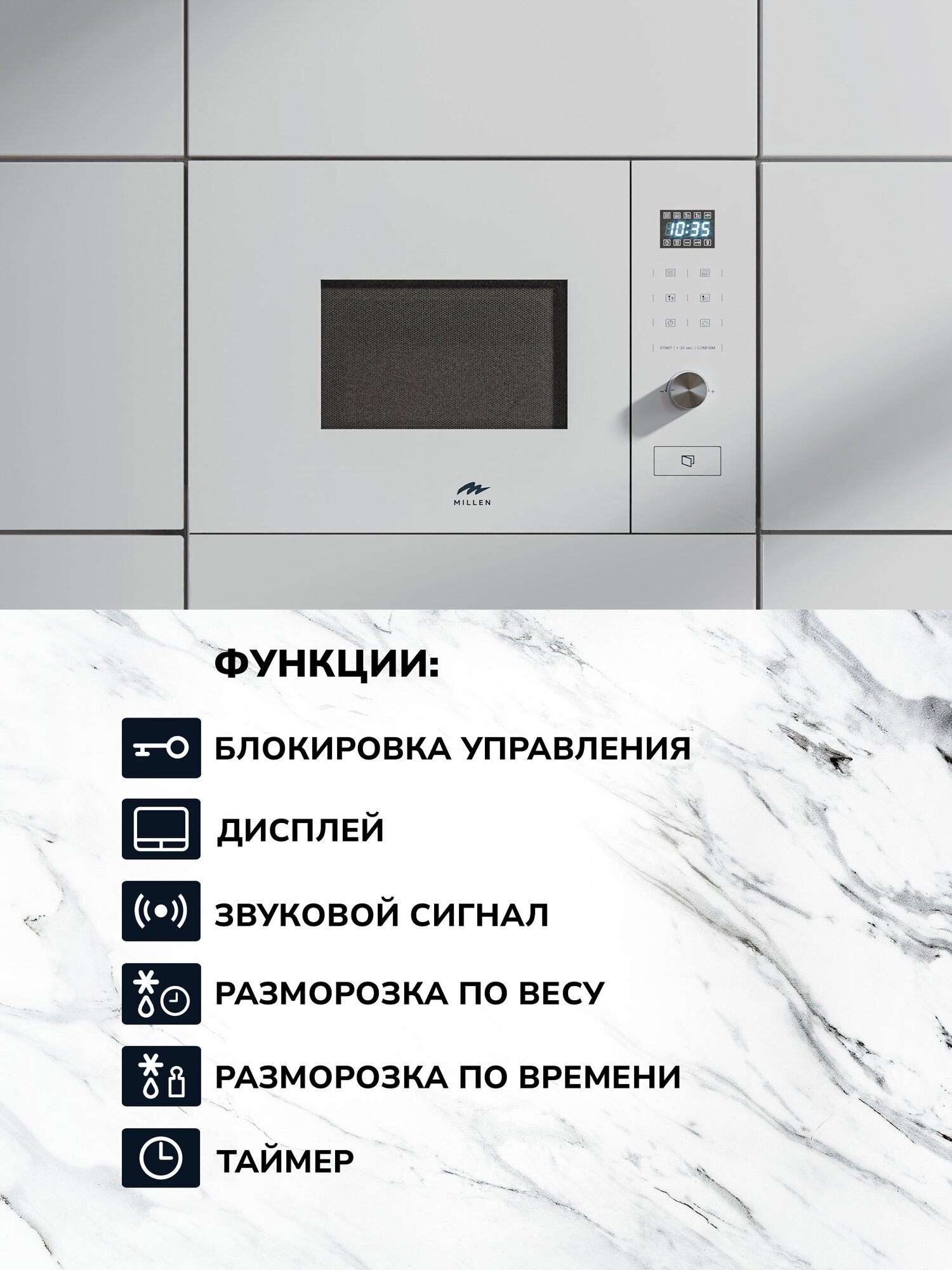 Встраиваемые микроволновые печи Микроволновая печь встраиваемая, MILLEN MBW 381 WH, белый, Блокировка управления, Дисплей, Звуковой сигнал, Разморозка по весу/времени, Таймер, Решётка для гриля, Мощность гриля 1000 Вт