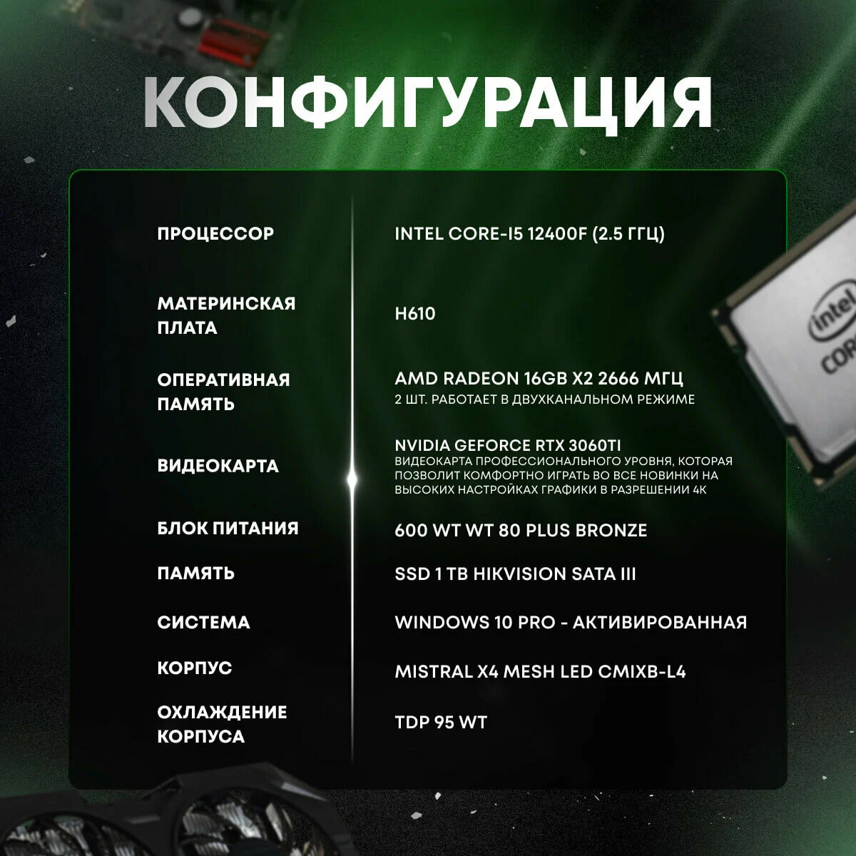 Персональные компьютеры Системный блок Intel Игровой компьютер (Intel Core-i5 12400f (2.5 ГГц), RAM 32 ГБ, SSD 1 TБ, NVIDIA GeForce RTX 3060ti (8 Гб), Windows 10 Home) черный
