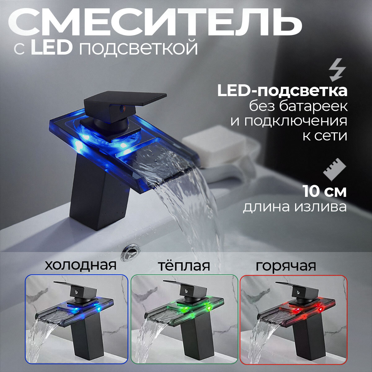 Смесители Смеситель для раковины с подсветкой и каскадным изливом Reji Black черный матовый, кран для ванной из нержавеющей стали