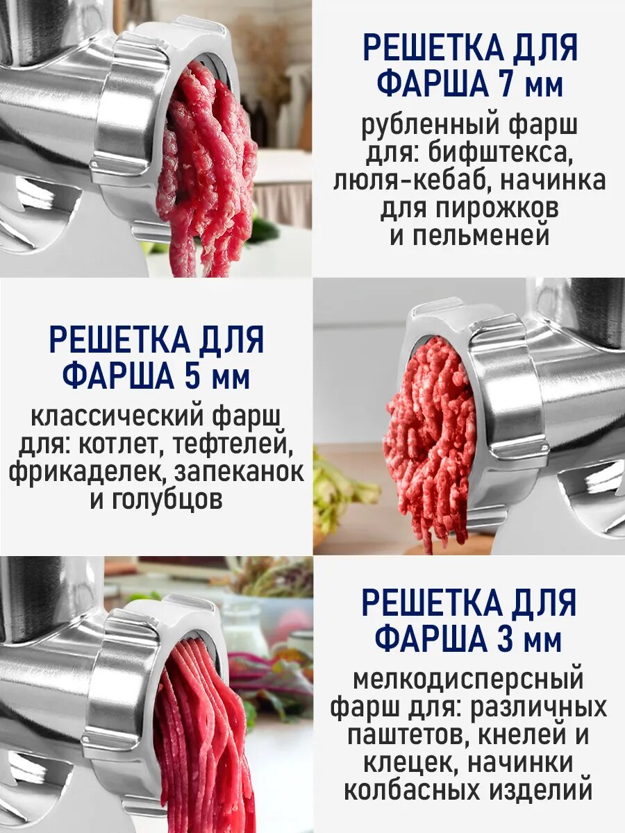| Насадки | 2 диска для фарша / для кеббе / для домашних колбас / для печенья |