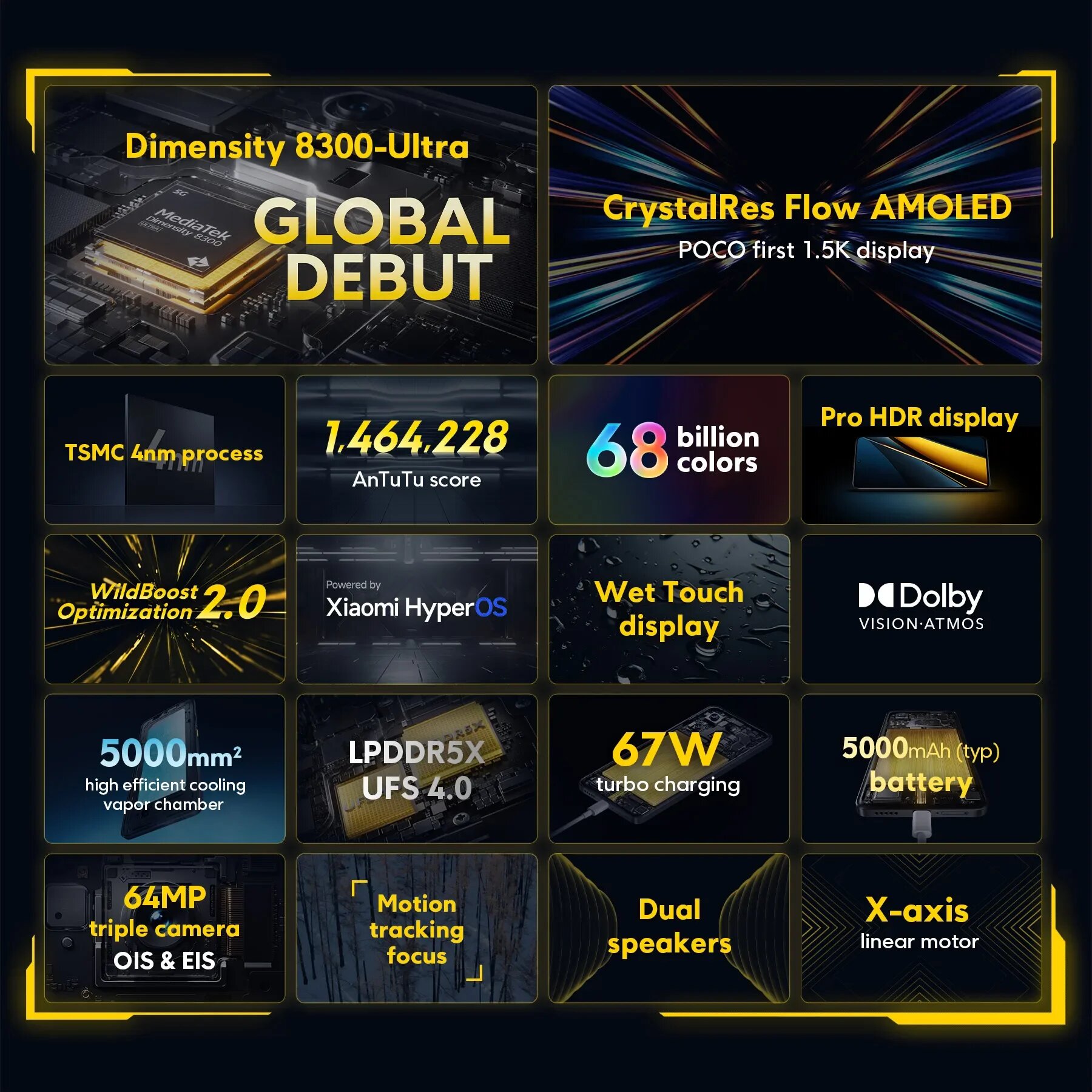 Мобильные телефоны POCO X6 Pro 5G, Смартфон , 256 ГБ/512 ГБ, Φ Dimensity 8300-Ultra 6,67 "120 Гц, DotDisplay 64 мп, тройная камера 67 Вт