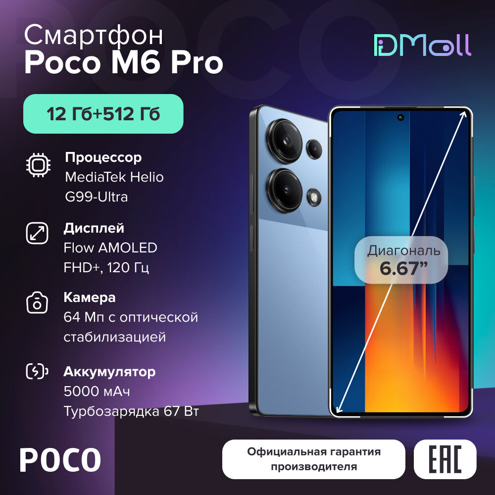 Мобильные телефоны Смартфон POCO M6 Pro RU 12+512 ГБ/Blue/6.67"FHD+/AMOLED/Ростест
