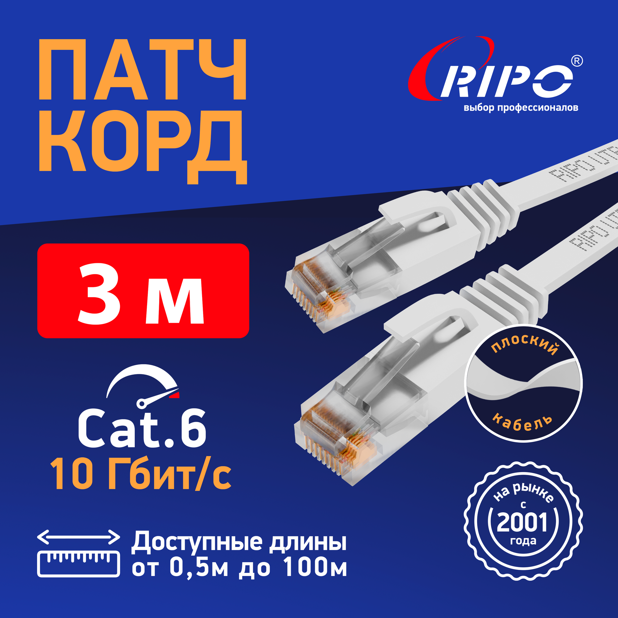 Персональные компьютеры Кабель для подключения интернета 3 м ютп4 кат6 лан провод интернет, патч корд плоский, витая пара UTP4 Cat6 RJ45 3 метра RIPO ССА белый 003-300140