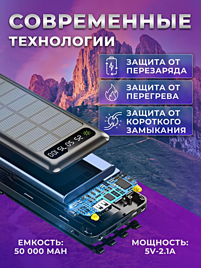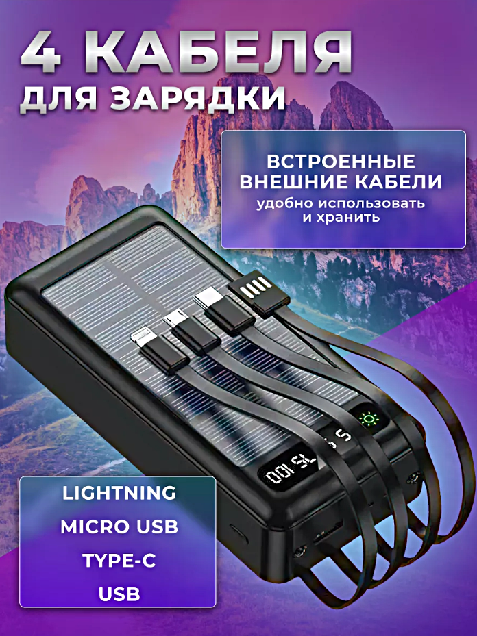 Портативный внешний аккумулятор POWER BANK 50000 mAh c солнечной батареей, 3 порта, 4 встроенных кабеля для зарядки, Черный 3 170 ₽ Подробнее