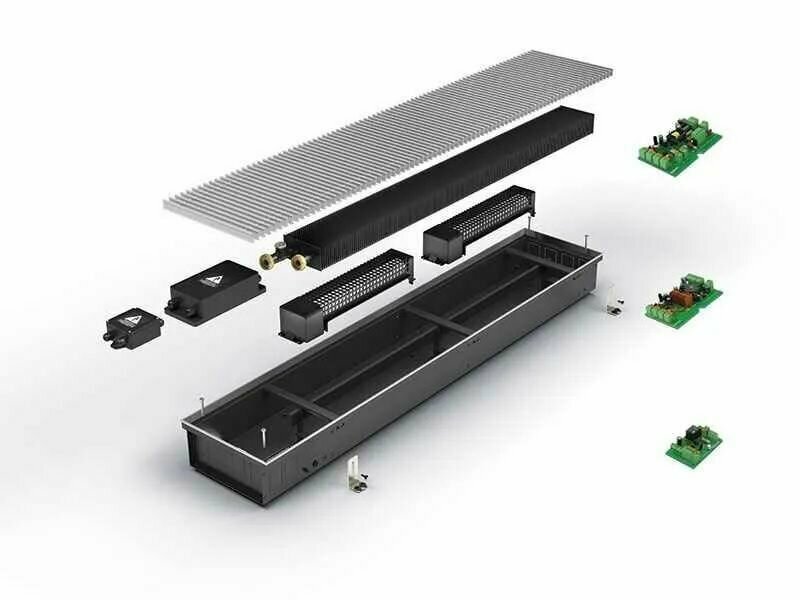 Радиаторы отопления Встраиваемый в Varmann пол конвектор с вентилятором Varmann Qtherm 230.75.2750 решетка роликовая из алюминия, анодированная в натуральный алюминий, декоративная рамка из U-образного профиля