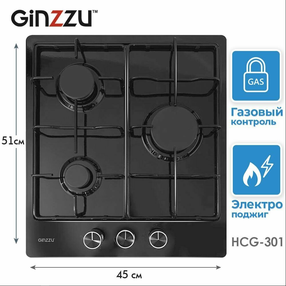 Варочные поверхности Варочная панель газовая Ginzzu HCG-301, черная эмаль, 3 конф, эл. поджиг, газконтроль