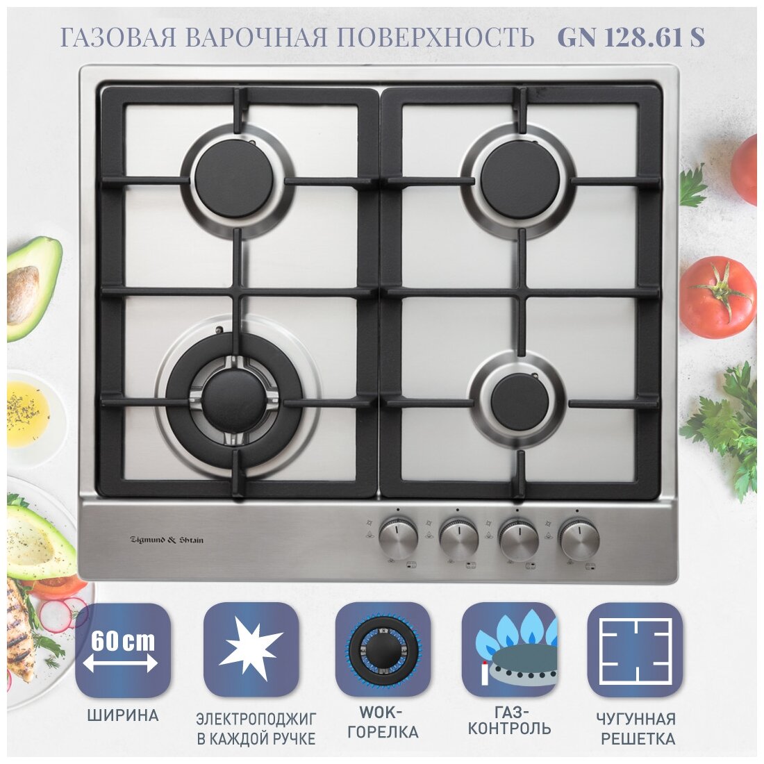Лучшие цены. Газовая варочная панель Zigmund & Shtain GN 128.61 S Особенности: Фронтальное управление Горелки Sabaf Электроподжиг в каждой ручке Газ-контроль WOK-горелка Чугунные решетки Матовые колпачки горелок Переходники для разных типов газа в комплекте Мощность горелок: 1 х WOK 3400 Вт 1 х 1880 Вт 1 х 1880 Вт 1 х 950 Вт Особенности: Общая мощность: 8110 Вт Ширина: 60 см Цвет: Нержавеющая сталь. Магазины в вашем городе.