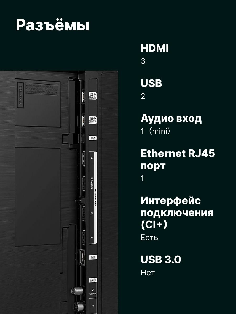 | Функции и возможности | AirPlay 2 / Wi-Fi 5 (802.11ac) / запись телепередач / Miracast / Bluetooth v 4.2 / поддержка DLNA / управление голосом |