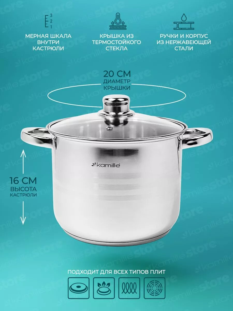 Кастрюля 15,5 л. из нержавеющей стали Kamille KM 5406 со стеклянной крышкой (15,5 л. / серебристый) 5 190 ₽ Подробнее