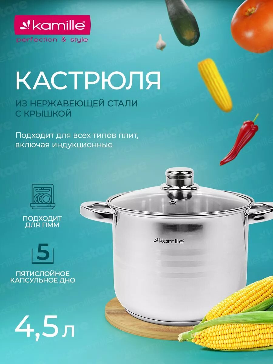 Кастрюля 4,5 л. из нержавеющей стали Kamille KM 5401 со стеклянной крышкой (4,5 л. / серебристый) 1 915 ₽ Подробнее