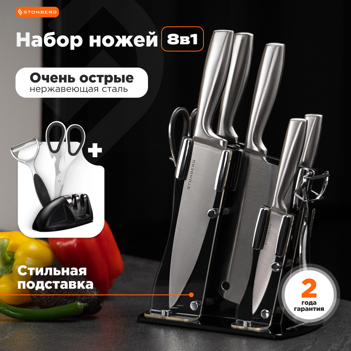 Наборы ножей Набор стальных кухонных ножей на подставке, острые, универсальные Stonberg KS-101-SL, 8 предметов, сталь/черный