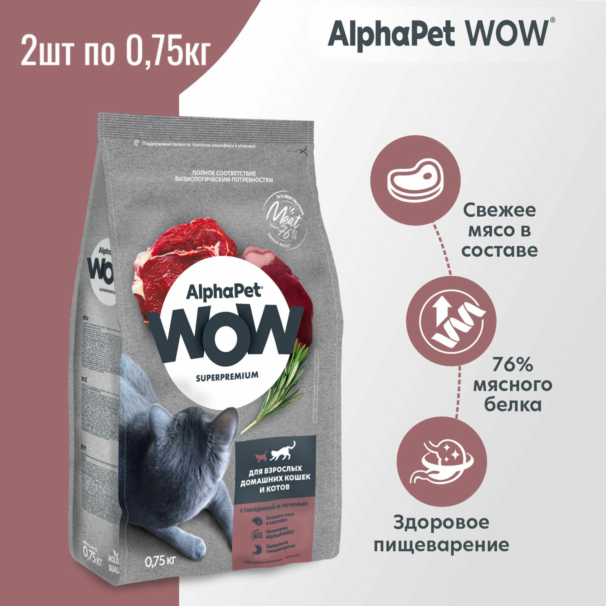 Корм для кошек Сухой корм для кошек AlphaPet WOW Superpremium, для взрослых домашних, c говядиной и печенью, 2 шт по 0,75 кг