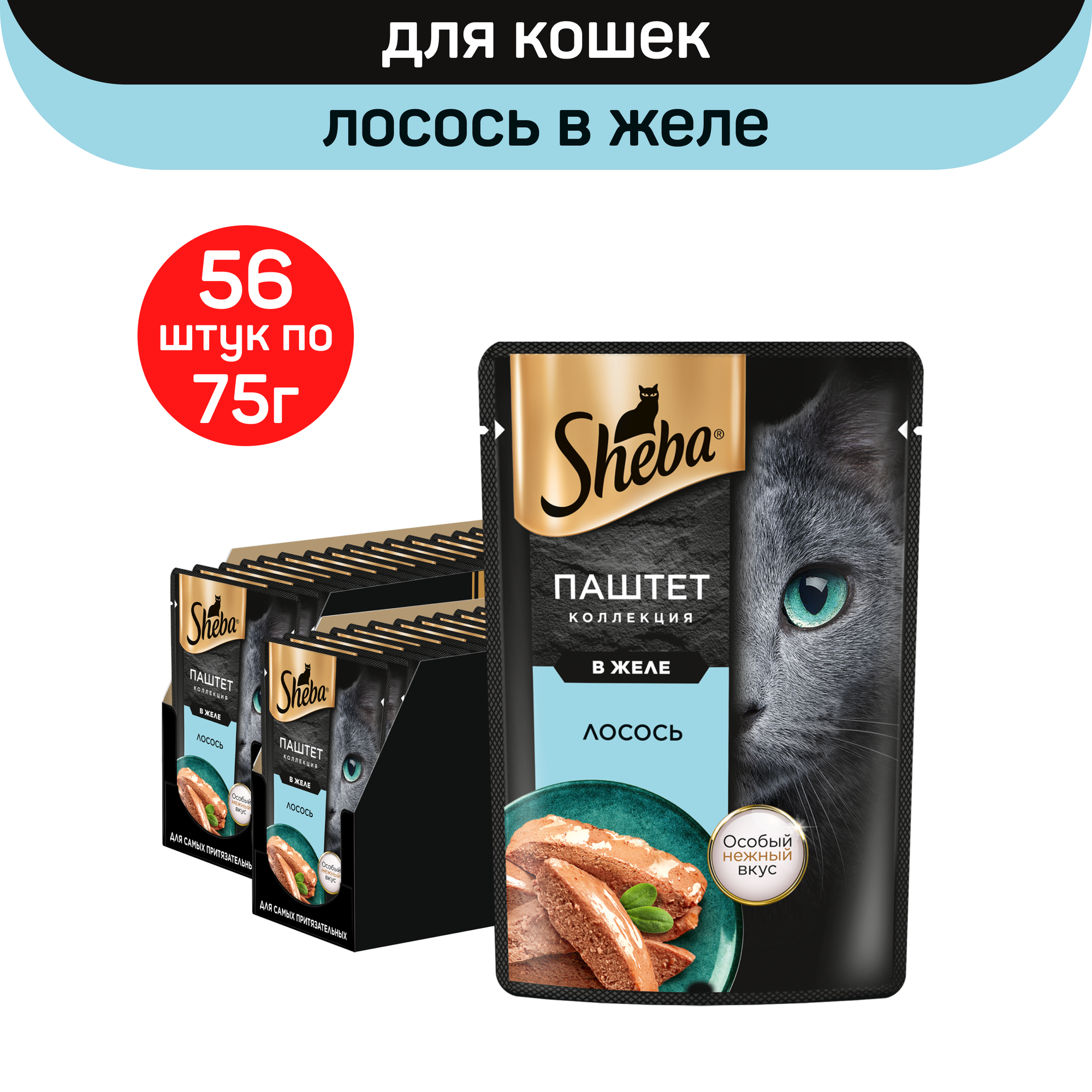 Корм для кошек Влажный корм для кошек SHEBA Нежный паштет в желе, с лососем, 56 шт по 75 г