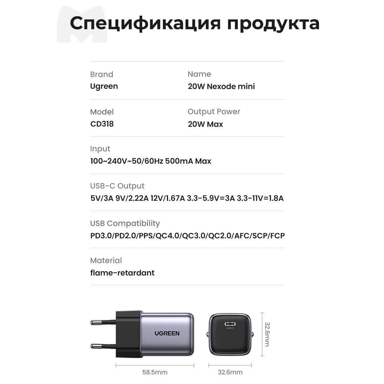 Сетевое зарядное устройство UGREEN CD318 (15324) Nexode Mini USB-C 20W PD GaN Fast Charger EU. Цвет: белый