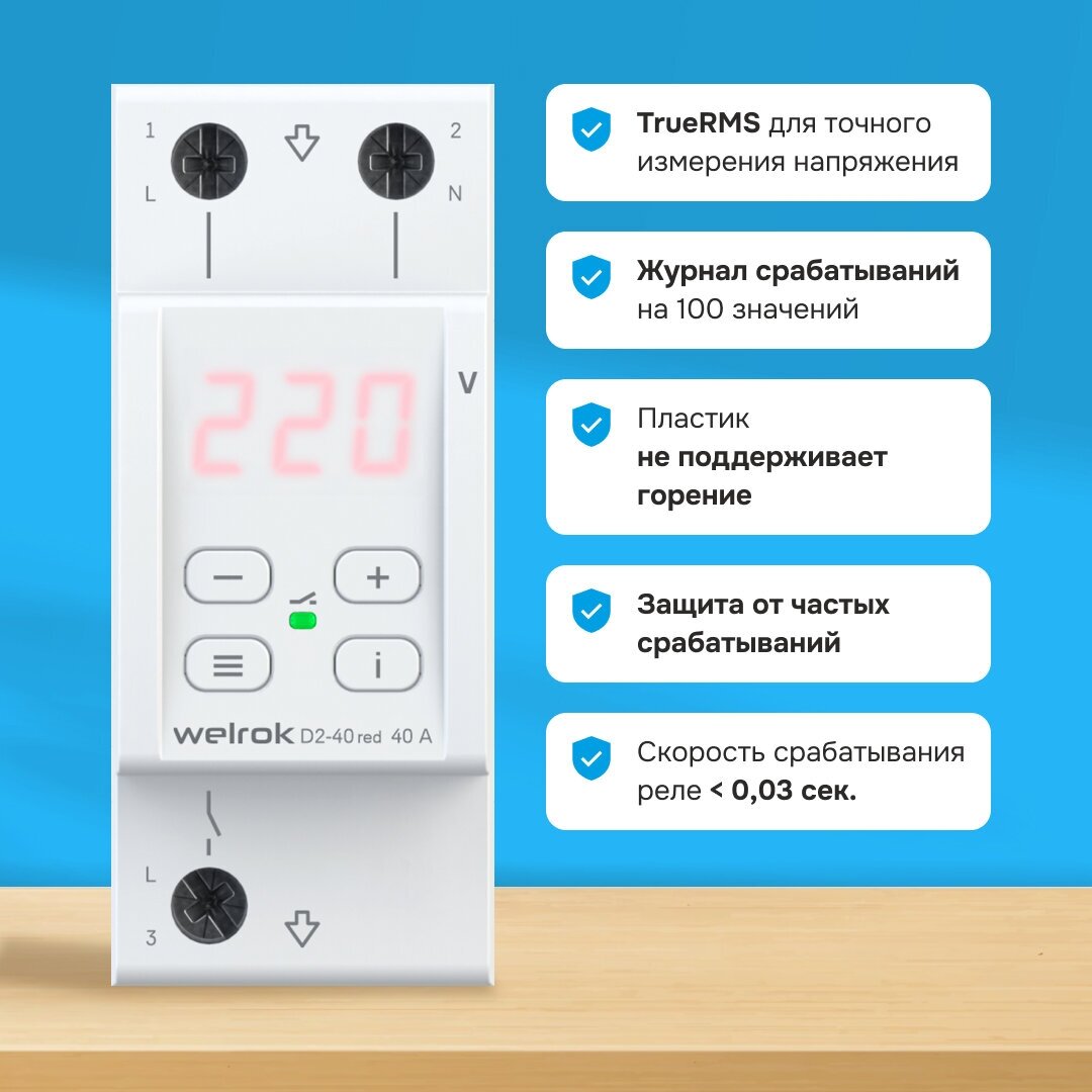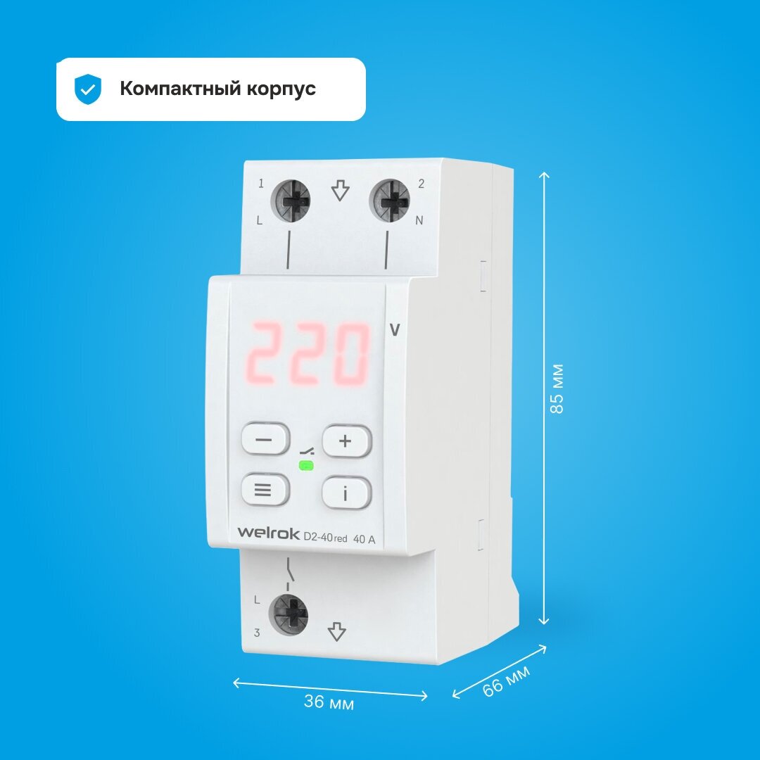 Реле контроля напряжения Welrok D2-40, 40А, однофазное, двухмодульное с белой индикацией, улучшенный аналог RBUZ D2-40