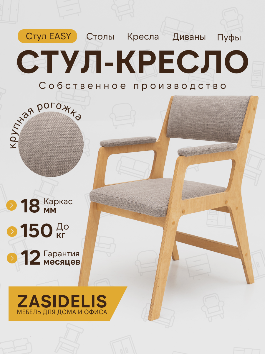 Cтул кресло ZASIDELIS ИЗИ для кухни дома и офиса светло кофе/натуральный, из рогожки, 53х62х84, до 150 кг 11 600 ₽ Подробнее