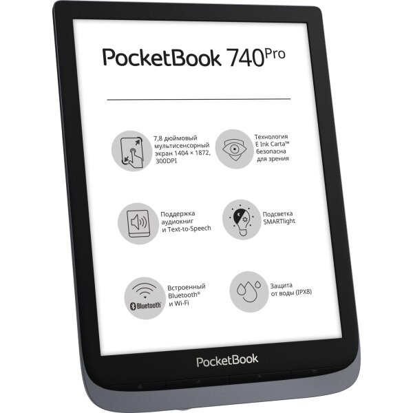Лучшие цены. Электронная книга PocketBook 740 Pro – простое и одновременно многофункциональное устройство. В компактном корпусе – 7,8-дюймовый монохромный экран. Даже при длительном чтении ваши глаза не будут сильно уставать. Используя эту модель, вы сможете регулировать цветовую температуру так, как будет удобно именно вам. Выбирайте холодные или тёплые тона от белого до оранжевого оттенка. Установите автоматическую смену яркости, и ридер будет настраивать подсветку в зависимости от окружающей обстановки. Магазины в вашем городе.
