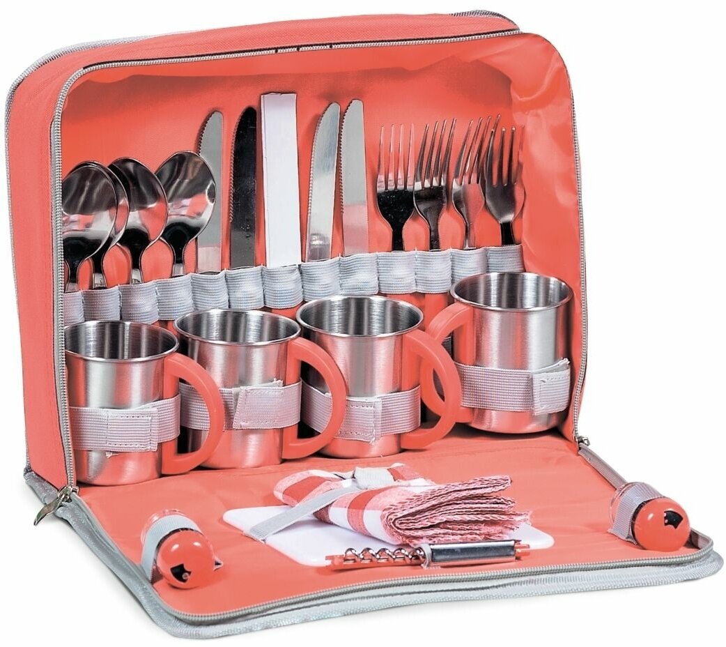 Лучшие цены. Столовые приборы и кружки изготовлены из полированной нержавеющей стали с пластиковыми ручками красного цвета. Салфетки выполнены из хлопка с принтом в клетку. Квадратная разделочная доска сделана из прочного пластика белого цвета, солонка и перечница - из прозрачного пластика. Все приборы компактно помещаются в специальную сумку из полиэстера, сумка закрывается на застежку-молнию; оснащена двумя удобными ручками для переноски и двумя вшитыми кармашками на молнии для хранения аксессуаров. Магазины в вашем городе.