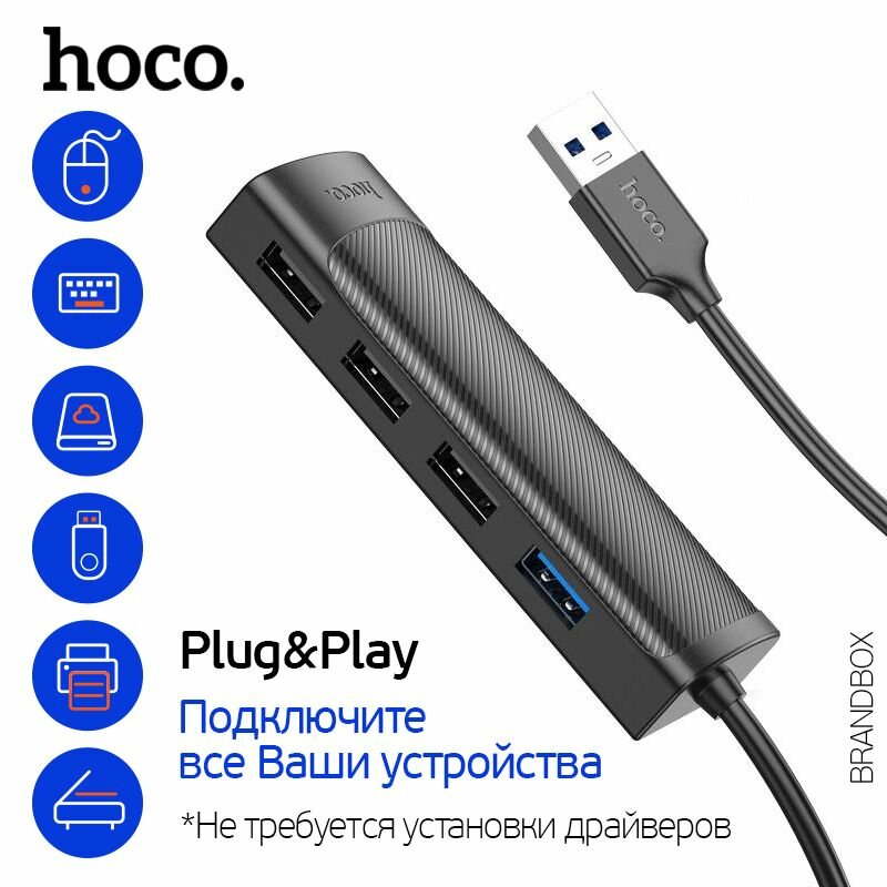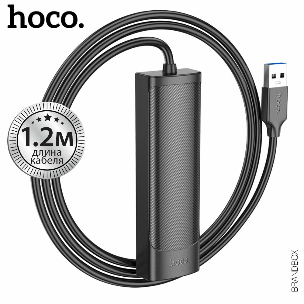 Картридеры и USB-хабы USB концентратор 4 в 1, Хаб для компьютера USB-A 3.0 интерфейс, 3хUSB 2.0; 1xUSB 3.0; кабель 1,2 м / Hoco HB41 Hub, черный
