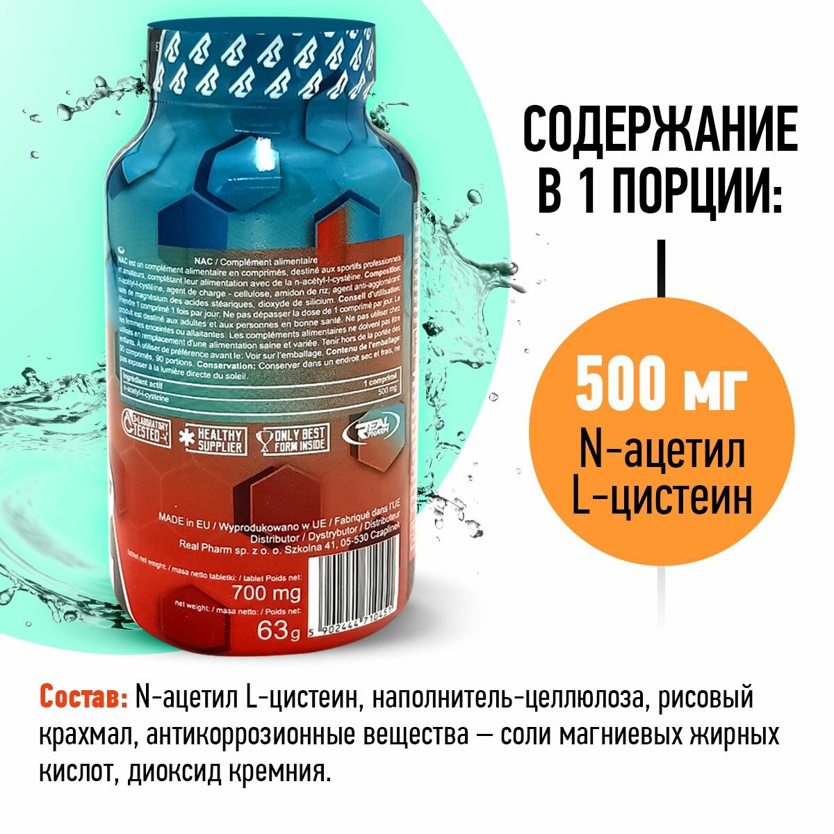 Аминокислоты Real Pharm NAC, Аминокислоты комплекс 500мг, 90 таблеток, Реал фарм N-ацетил-L-цистеин для регенерации мышц и выносливости