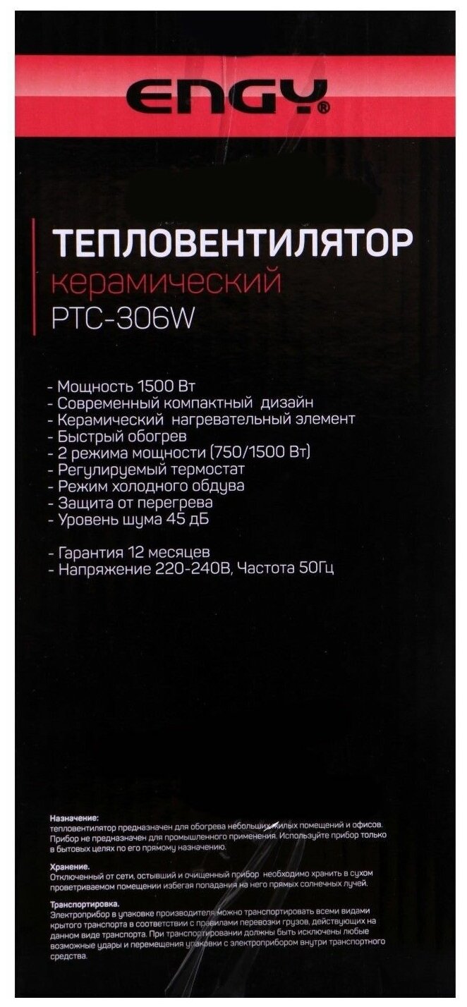 Тепловентилятор ENGY PTC-306W, 750/1500 Вт, керамический, 2 режима, до 20 м²