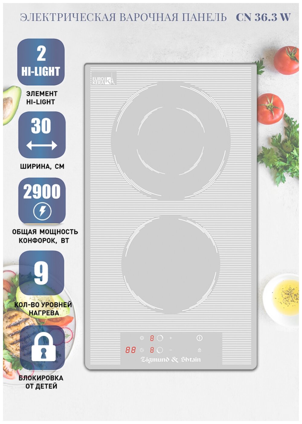 Лучшие цены. Электрическая варочная поверхность Zigmund & Shtain CN 36.3 W позволяет готовить в посуде разного объема благодаря возможности включения/выключения дополнительного контура нагрева. Данная модель оснащена 2 электрическими конфорками, 9 уровнями мощности, индикатором остаточного тепла. Верхняя панель изготовлена из стеклокерамики в элегантном белом цвете. Этот материал обеспечивает стильный внешний вид и характеризуется практичностью. Магазины в вашем городе.