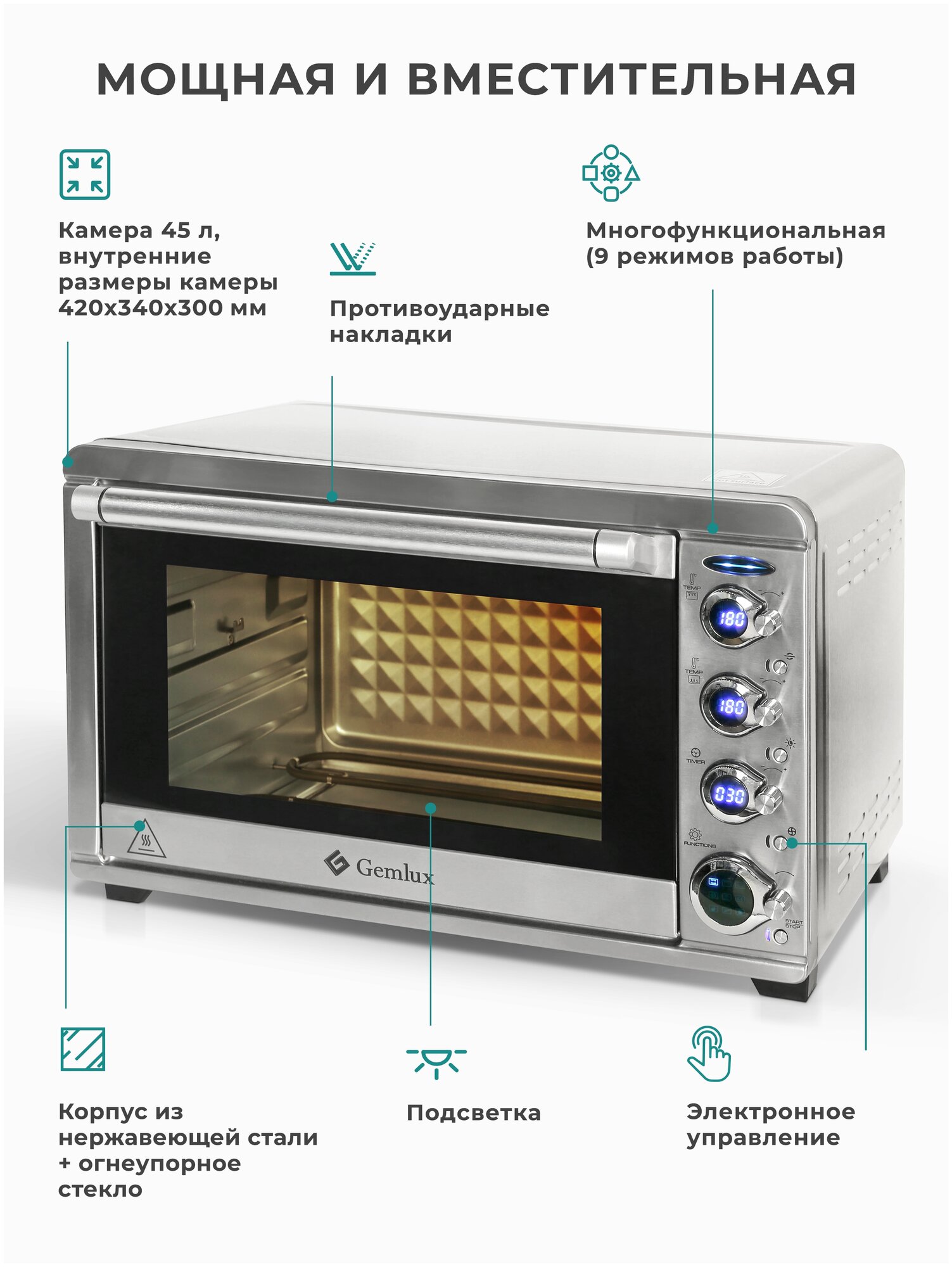 Мини печь с конвекцией и грилем GEMLUX GL-OR-2045LUX, 45 л, 2000 Вт, минипечь, электропечь для выпечки, печка, духовка электрическая настольная, электродуховка, духовой шкаф, бытовая техника для кухни