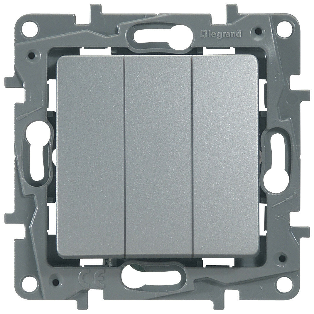 Лучшие цены. Трехклавишный выключатель Legrand Etika для встроенного монтажа, цвет алюминий, в сборе. Предназначен для сетей до 250 В на ток до 10 А. Быстрозажимные клеммы, использующиеся в выключателе, обладают рядом преимуществ в сравнении с обычными винтовыми. Устройства с такими клеммами быстрее и проще подключать, а надежность соединения гораздо выше. Винтовое соединение со временем ослабевает, что может привести к короткому замыканию. Магазины в вашем городе.